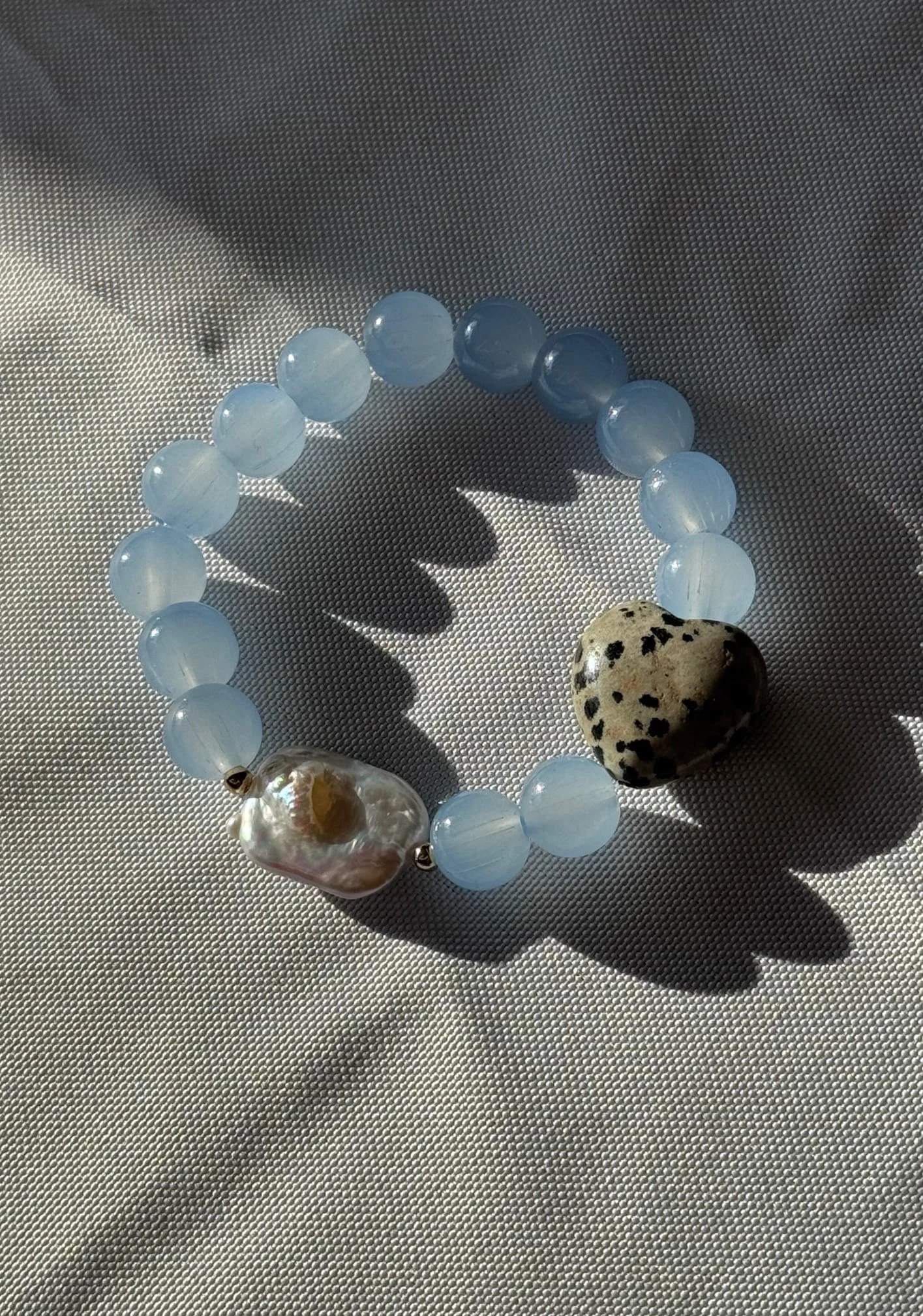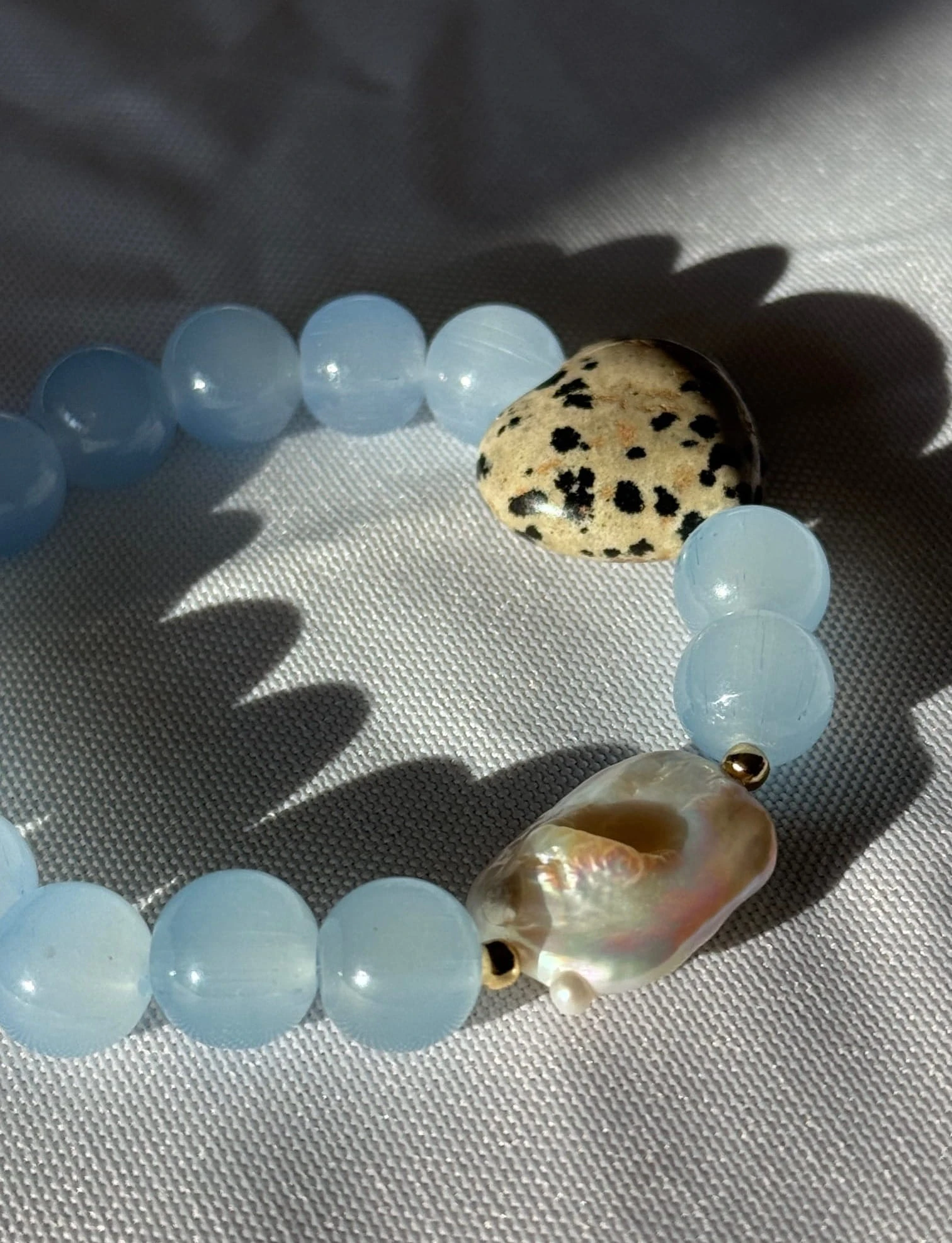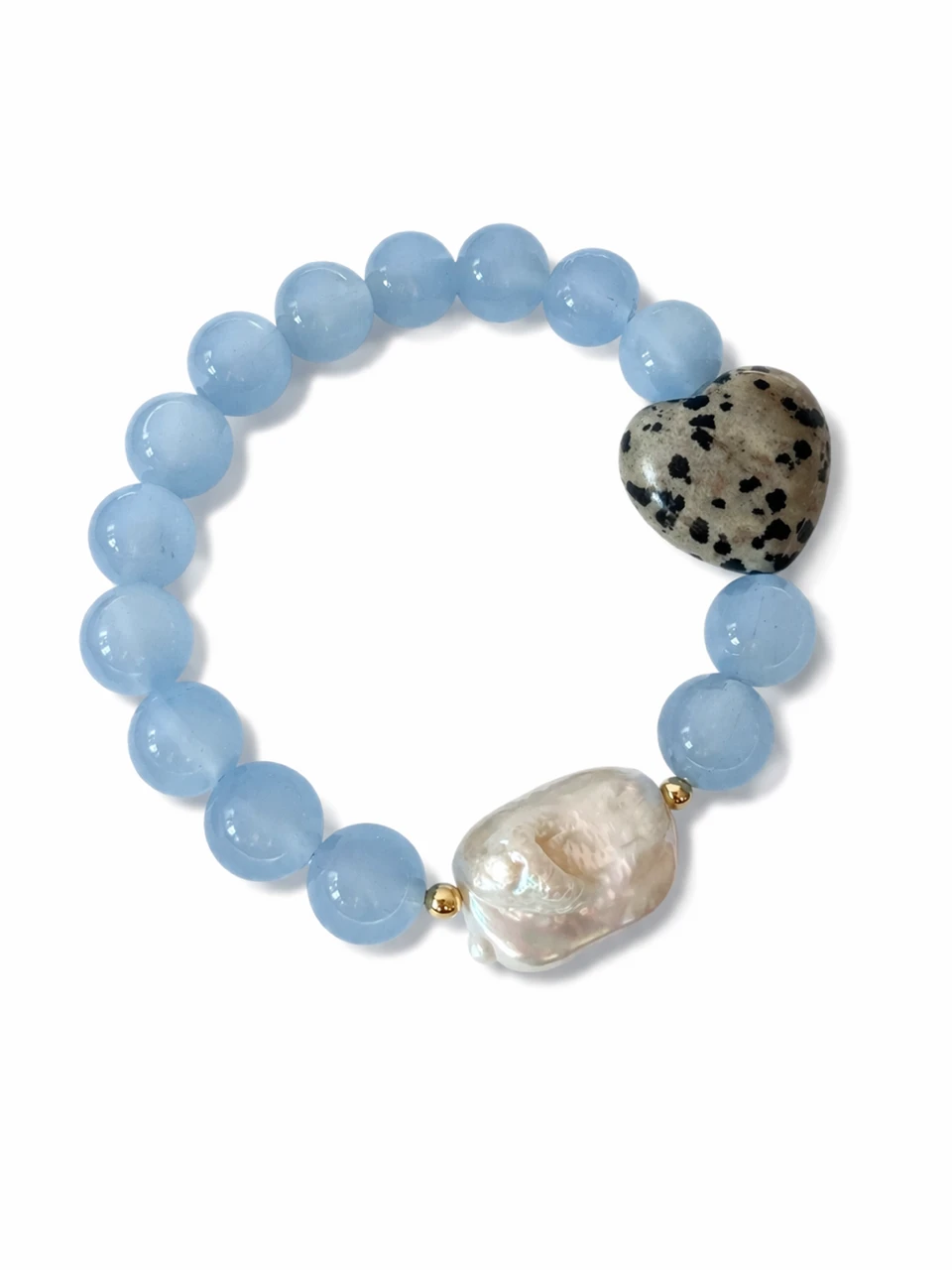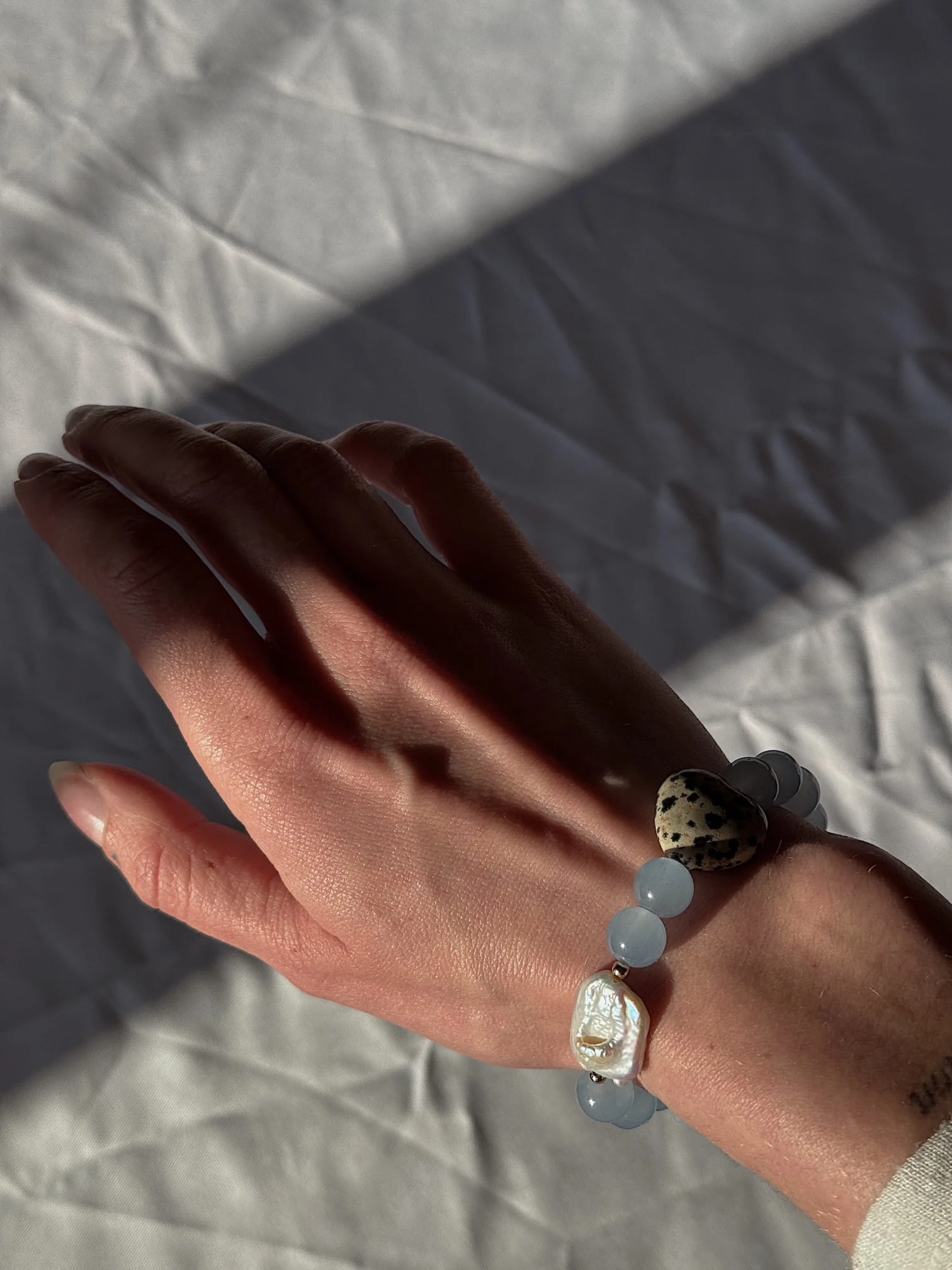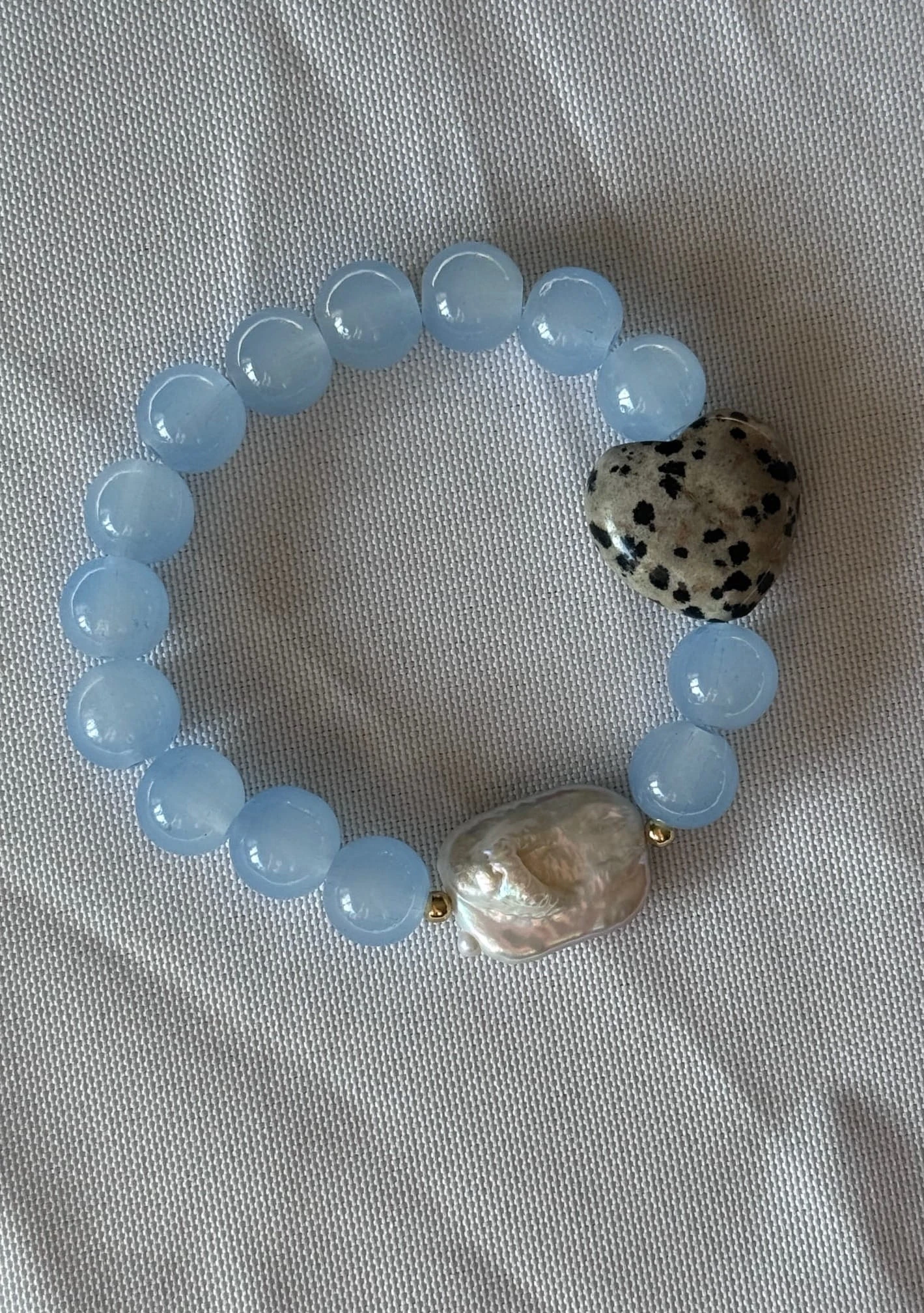 Bransoletka z kolekcji Aura to subtelna, ale wyrazista biżuteria, która łączy delikatność z charakterem. Wykonana z gładkich, niebieskich koralików, ozdobiona sercem z jaspisu dalmatyńskiego oraz dużą, nieregularną perłą naturalną, tworzy harmonijną i wyjątkową kompozycję.