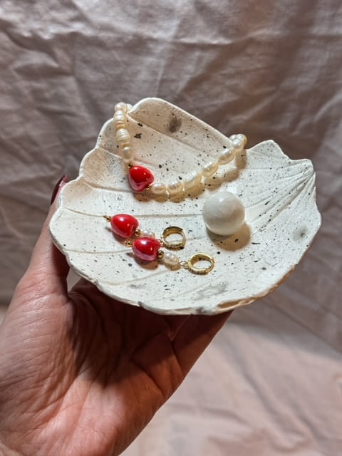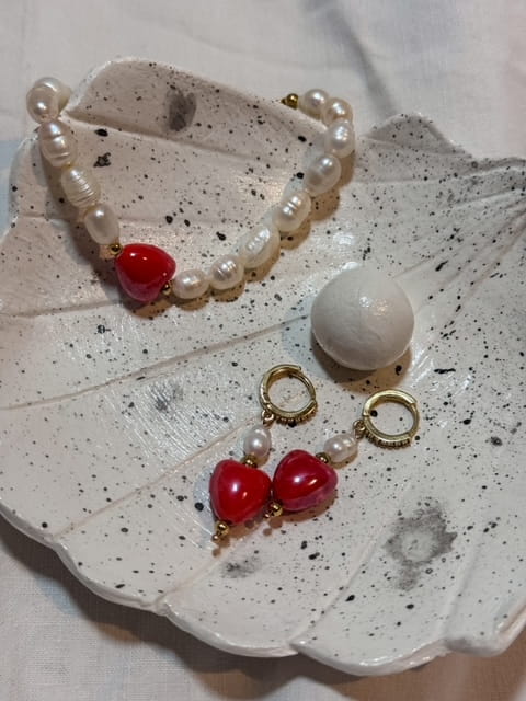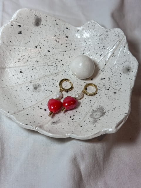 - Ceramiczne serduszka: Czerwone serduszka dodają kolczykom niepowtarzalnego charakteru. To symbol miłości i pasji, który świetnie komponuje się z klasycznym stylem pereł.