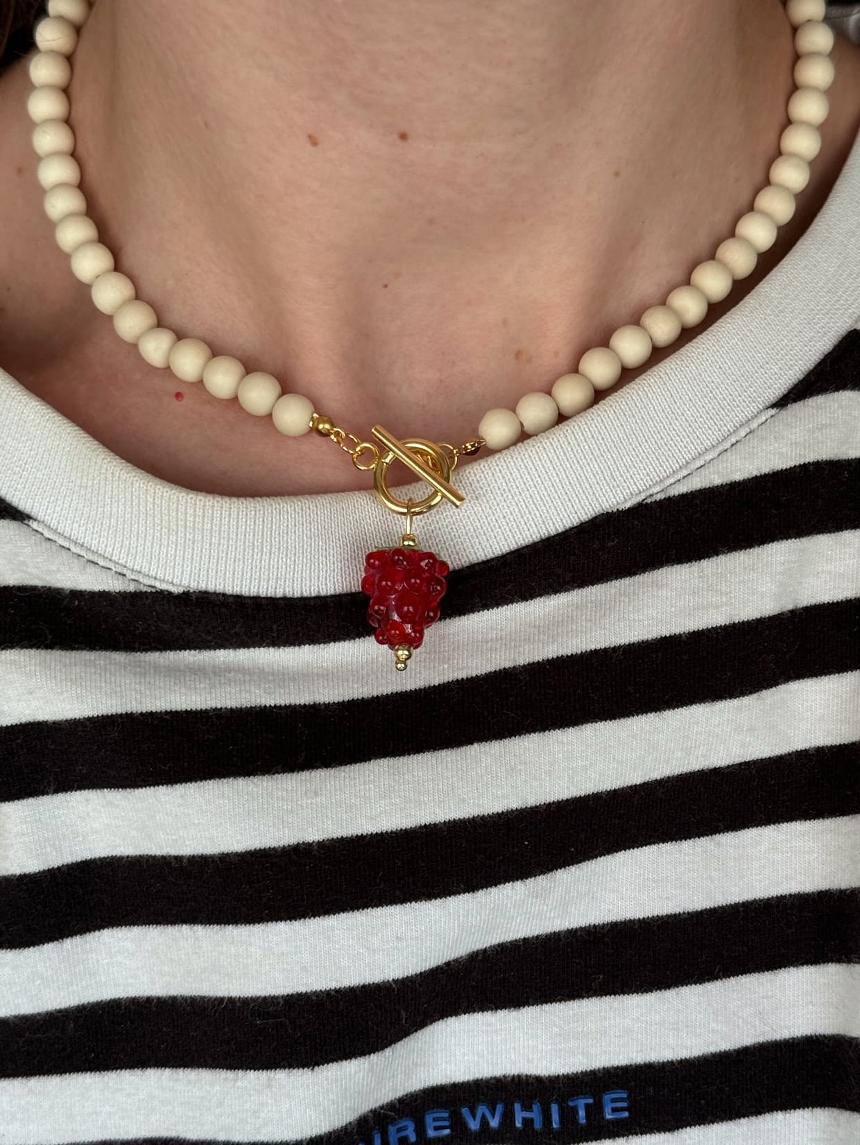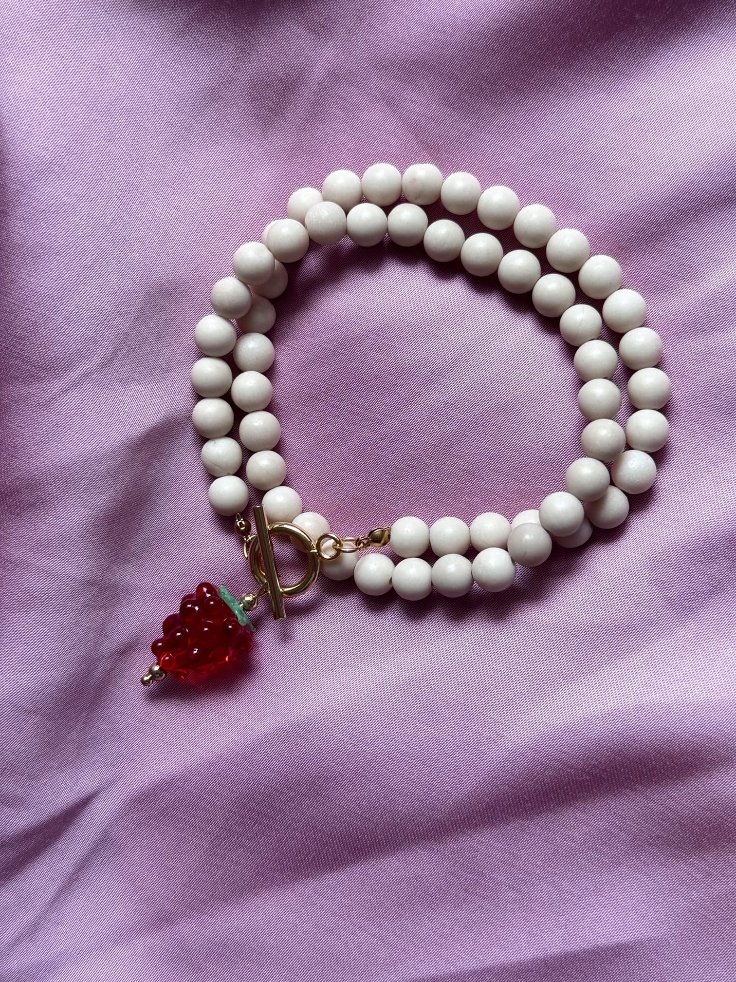 Odkryj magię rękodzieła z naszym wyjątkowym naszyjnikiem JASMINE, stworzonym z myślą o kobietach, które pragną dodać odrobinę świeżości i koloru do swojej biżuteryjnej kolekcji. Ten naszyjnik handmade łączy w sobie naturalne kamienie rzeczne, które emanują harmonią i pozytywną energią, oraz urokliwy koralik w kształcie soczystej maliny, który przyciąga wzrok i rozwesela każde stylizacje.